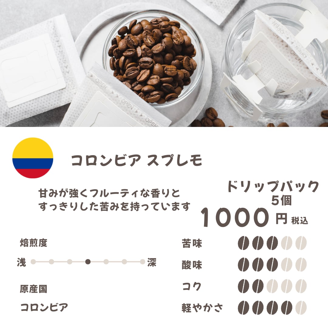 産地: コロンビア特徴: 「コロンビア・マイルド」と称される、なめらかで良質な味わい。芳醇な香りと奥行きのあるコク、そしてバランスの取れた風味が魅力です。穏やかな酸味と甘みが特徴で、どんなシーンにも寄り添う一杯です。
